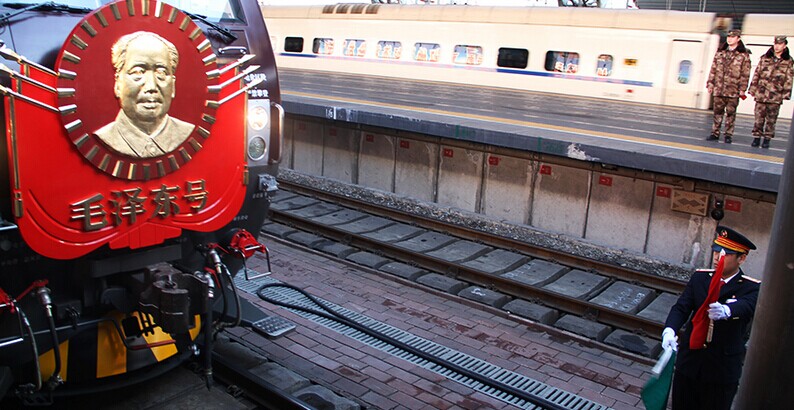 2014年12月25日 北京站 25日下午换型后的“毛泽东号”机车牵引T1次列车驶出北京站。当日,第五次换型后的“毛泽东号”机车正式投入运行,牵引T1次列车由北京站始发,将于12月26日毛泽东诞辰121周年纪念日当天早晨抵达终点站长沙站。 “毛泽东号”机车诞生于1946年10月,现隶属于北京铁路局丰台机务段。68年来,从最初的蒸汽机车到内燃机车,再到此次换型后的和谐3D型大功率电力机车,“毛泽东号”见证了中国铁路的发展与进步,更创造了累计安全行驶963万公里的业绩,被誉为“火车头中的火车头”。